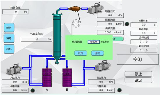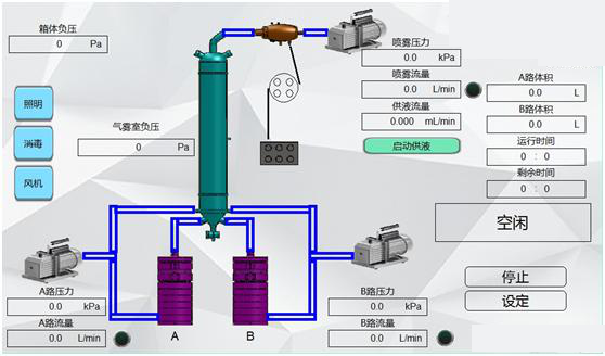 在試管中加入適量70%酒精,接入系統(tǒng)管路中,進入“系統(tǒng)消毒”模式,設(shè)定蠕動泵流量、噴霧流量及時間后,開始消毒。